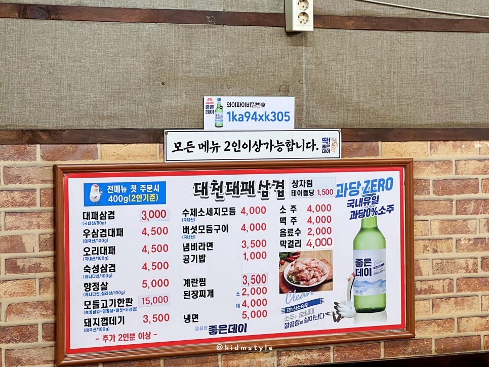 메뉴판이다. 테이블당 상차림비 1,500원이 있고 대패삼겹살 1인분은 80g에 3,000원으로 저렴한 편이다. 요즘 보통 90g에 3,800원 정도 하는데 가격이 조금 저렴한 건 맞다.