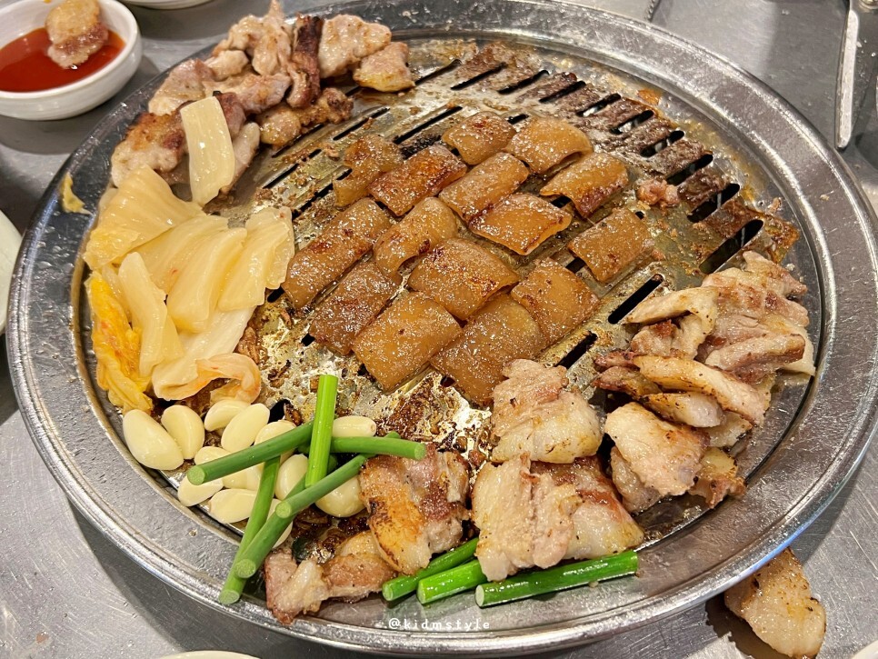 고기 좀 아는 분들은 바로 아시겠지만 부위 적당하고 때깔 좋은 삼겹살을 가운데에 굽고 테두리에 껍데기를 배치하여 굽는다. 삼겹살이 먼저 구워지면 껍데기와 위치교환 후 가운데에서 껍데기를 굽는 시스템이다.