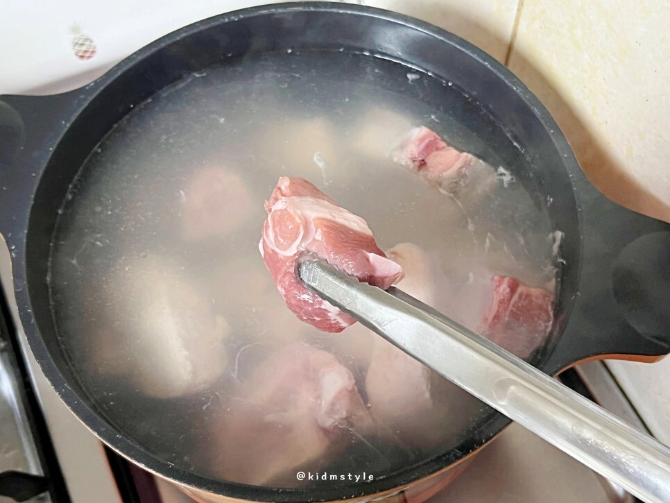 고기를 데치는 시간은 딱 10분이다. 냉장 갈비는 핏물 뺄 필요는 없다. 냉동 LA갈비 할 때는 물론 핏물 빼주면 좋고.
