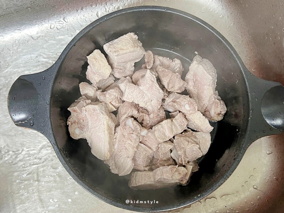 데치는 과정에서 나온 이물질 등이 남아있을 수 있으니 고기를 꺼내서 찬물에 헹궈준다.