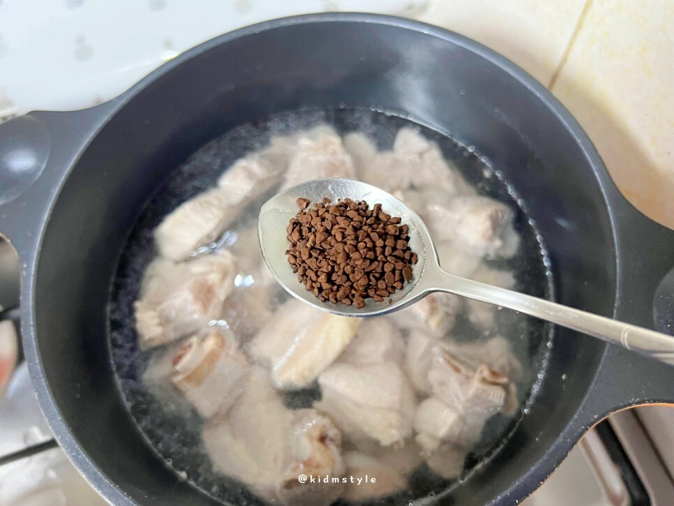 커피 반 숟가락 넣는데 집에 알 커피가 없어서 뭘 넣을지 고민하다가 마침 카누가 있어서 그걸 넣었다. 커피는 잡내 제거를 위해 넣는다.