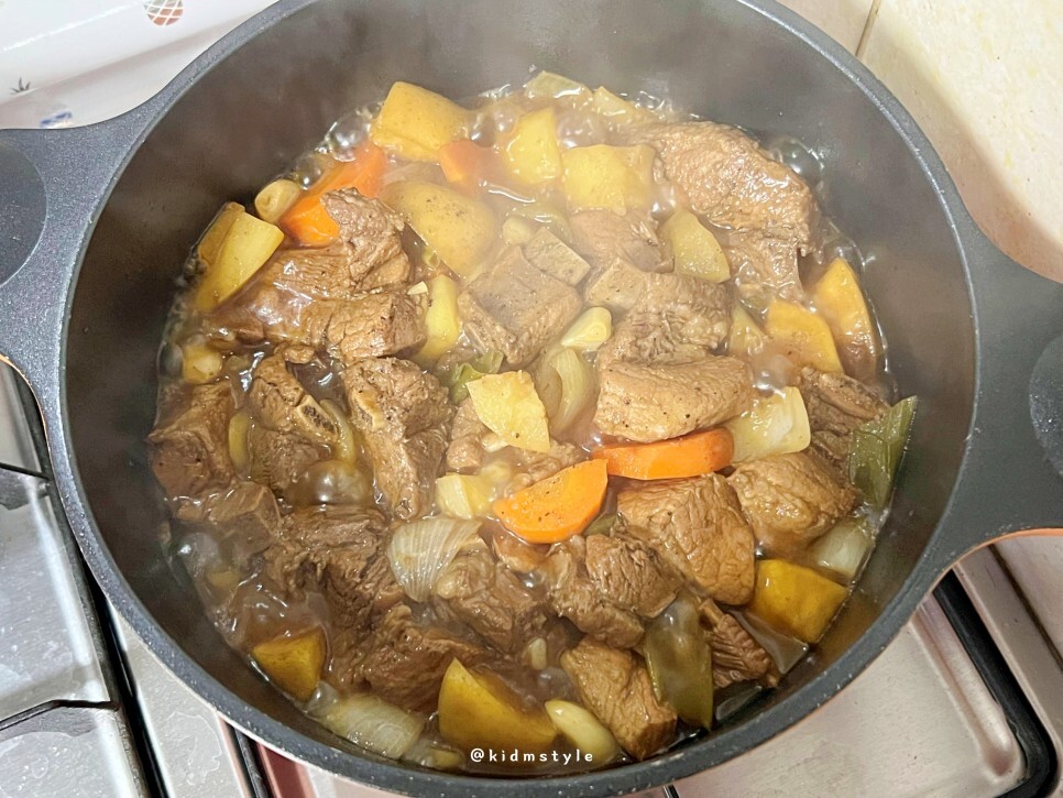 강불 20분, 중불 15분로 조리 후 채소와 간장을 넣고 약불에서 10분간 조리할 예정이다.