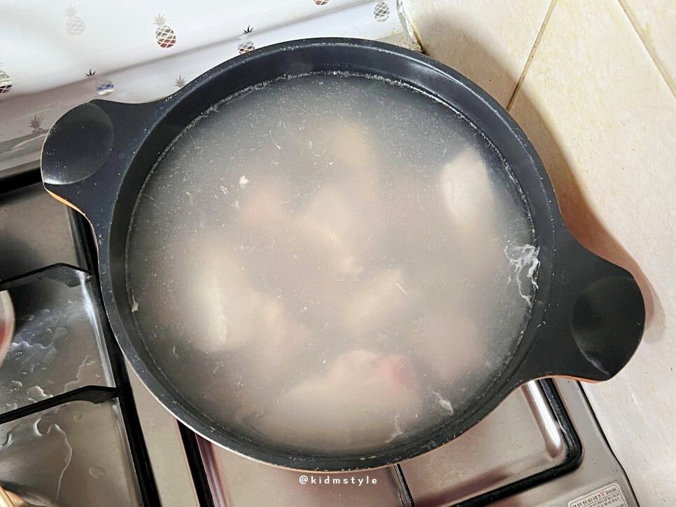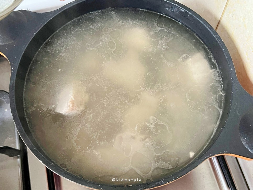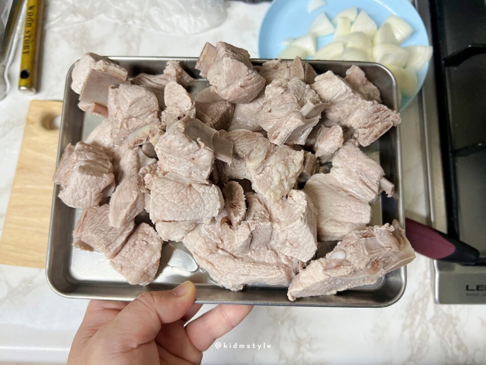 먼저 고기를 데칠 용도로 물을 팔팔 끓인다. 참고로 오늘 레시피는 온라인에서 찾다 보니 알토란이라는 프로그램에서 임성근 님이 소개한 레시피더라. 그 레시피를 참고하여 내 방식대로 조금 변형하였다. 임성근 님은 예전에 한식대첩 때 참 인상 깊었는데 승승장구하시네.