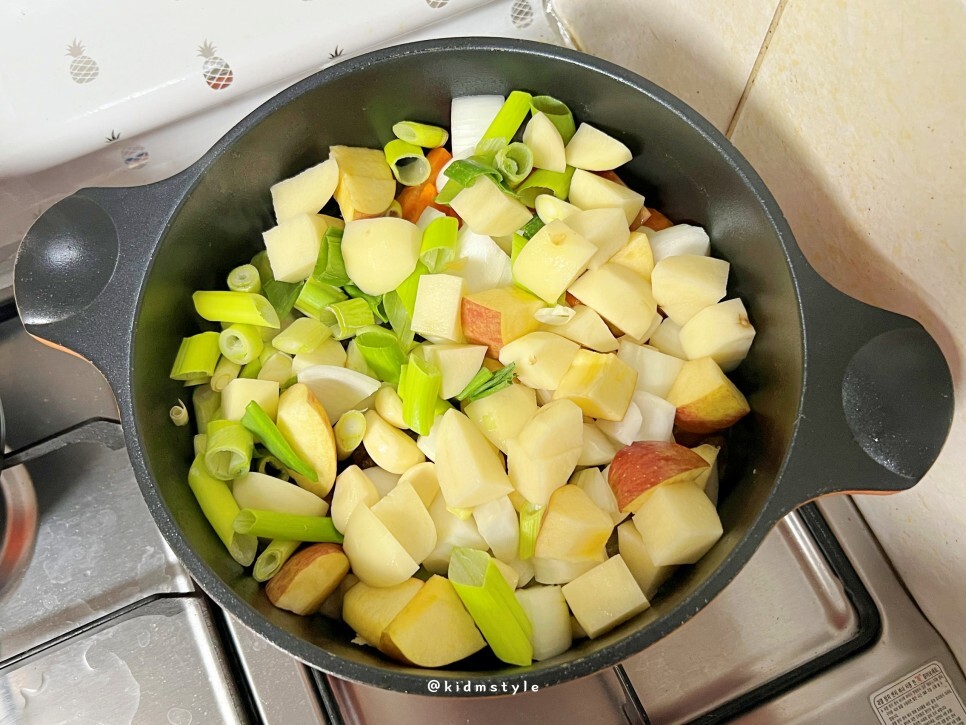 채소는 아까 데치는 동안 썰어두었다. 뭐 많이 안 들어간다. 감자, 사과, 대파, 당근, 양파, 마늘 정도 들어간다. 취향껏 가감하면 될 것이다.