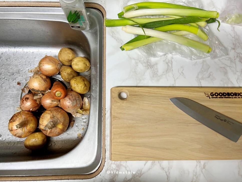 양파, 감자, 당근, 대파를 꺼내서 손질을 시작한다. 아껴서 사용하고 있는 도마를 오래간만에 꺼냈다. 의미 있는 소중한 도마라 그렇다.