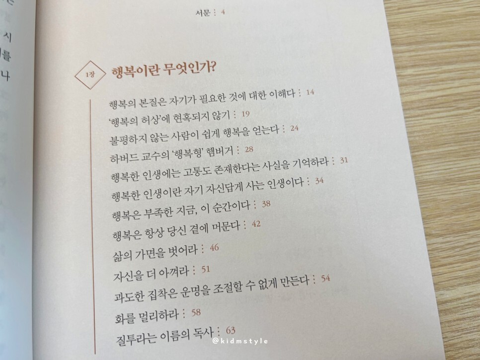 책 목차를 살펴보면 우리가 어쩌면 가장 중요하게 생각하는 행복을 주제로 시작한다. 소제목을 보면 알겠지만 쉬운 주제이다. 그래서 책이 더 쉽게 읽어지기도 한다. 그렇다고 이미 다른 책에서 많이 볼 수 있었던 틀에 박힌 이야기를 하는 건 아니다. 다양한 이야기를 통해 설명하기에 집중해서 읽기 시작하였다.