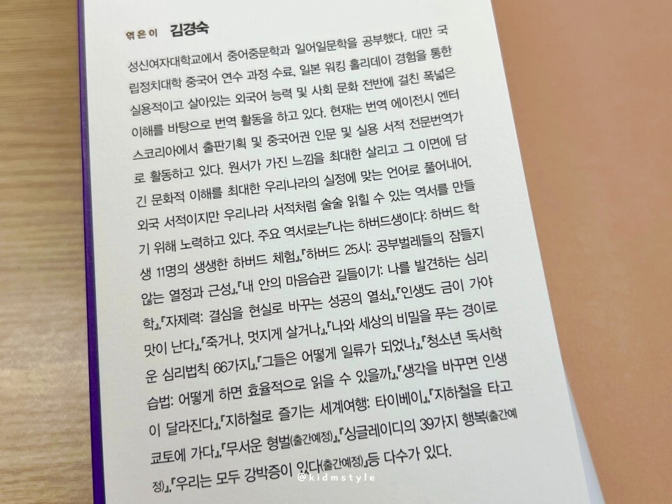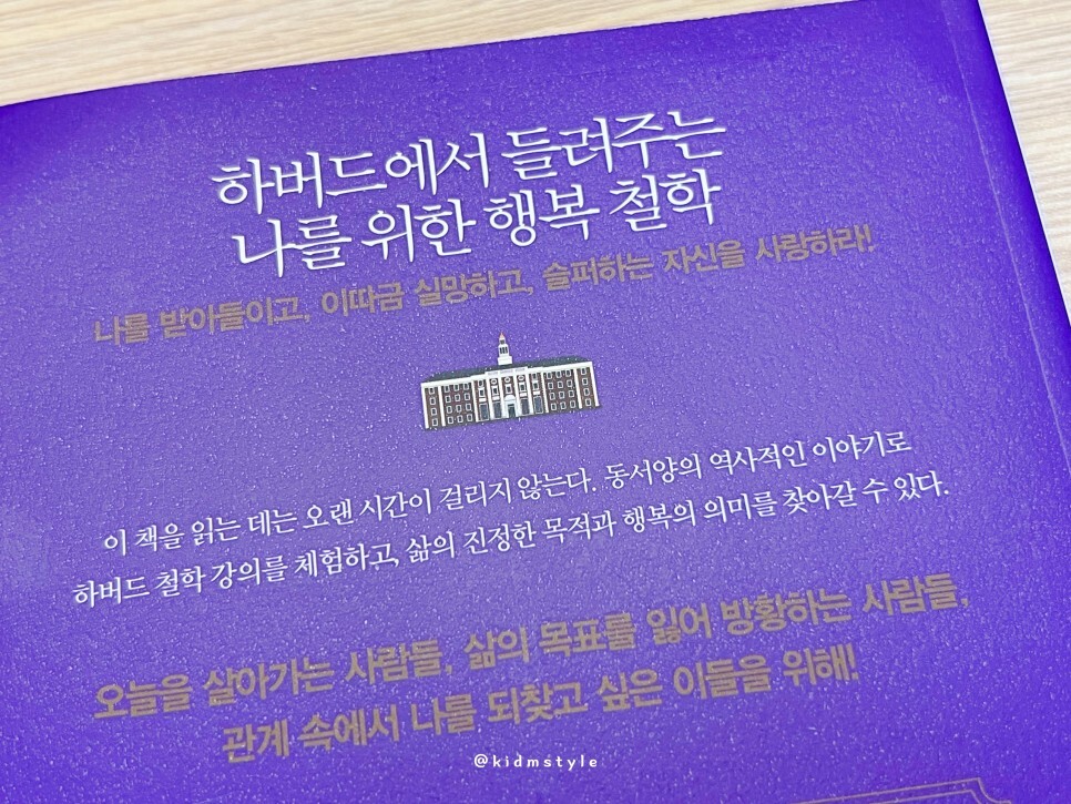 동서양의 역사적인 이야기로 하버드 철학 강의를 체험하고 삶의 진정한 목적과 행복의 의미를 찾아갈 수 있다고 적고 있다. 오늘을 살아가는 사람들, 삶의 목표를 잃어 방황하는 사람들, 관계 속에서 나를 되찾고 싶은 이 등 모두에게 어울리는 책인 것 같다.