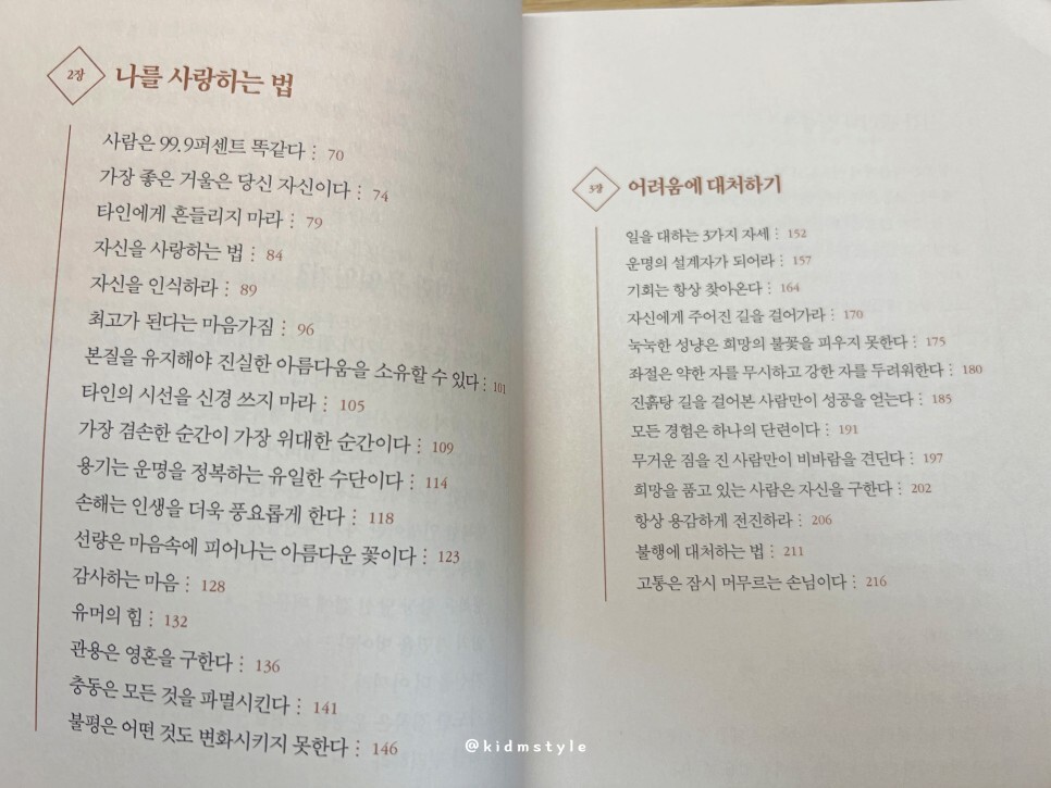 본 책은 동서양의 역사적인 다양한 에피소드를 소개하며 철학을 이야기한다. 그리고 우리 모두가 밀접하게 겪는 일상의 이야기들, 행복, 나 자신을 사랑하는 법, 시간 관리 등을 쉽게 풀어내더라.