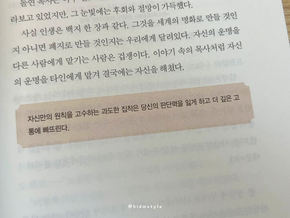 정말 와닿는 문구였다. 자신만의 원칙을 고수하는 과도한 집착은 당신의 판단력을 잃게 하고 더 깊은 고통에 빠뜨린다.