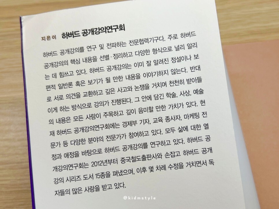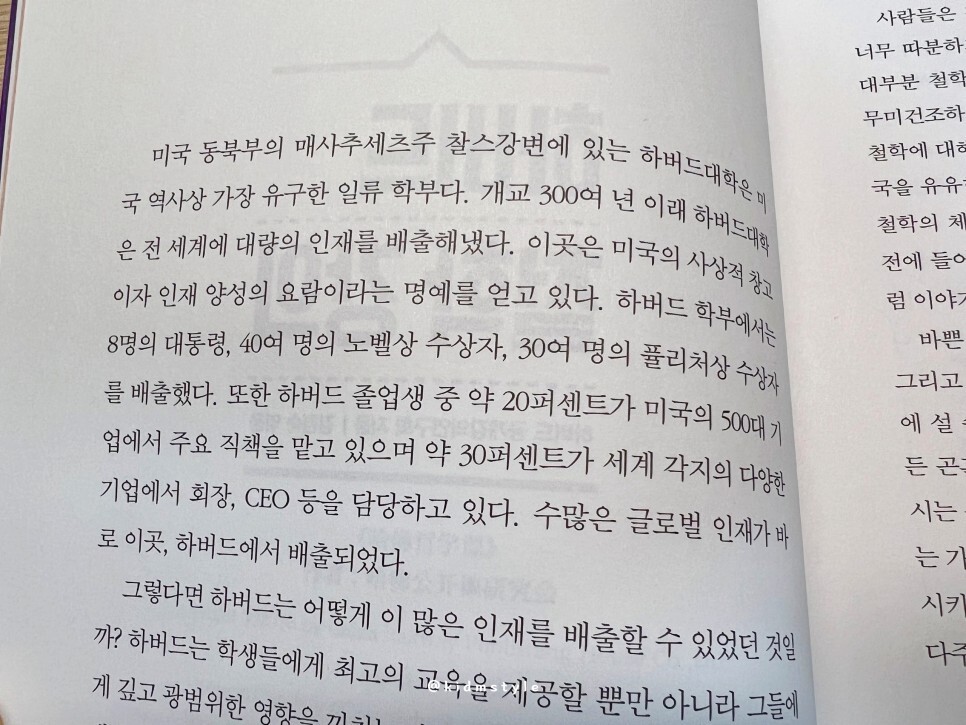 이 많은 인재들을 배출할 수 있었던 하버드는 학생들에게 최고의 교육을 제공할 뿐만 아니라 그들에게 깊고 광범위한 영향을 끼치는 하버드 철학을 가지고 있으며 전파하고 있다. 그 철학을 바탕으로 한 강의가 이 책에 녹아있는 거고.