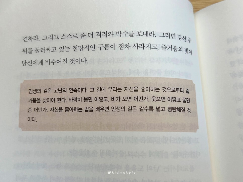 인생의 길은 고난의 연속이다. 그 길에 우리는 자신을 좋아하는 것으로부터 즐거움을 찾아야 한다. 바람이 불면 어떻고, 비가 오면 어떤가. 웃으면 어떻고 울면 좀 어떤가. 자신을 좋아하는 법을 배우면 인생의 길은 갈수록 넓고 평탄해질 것이다.
