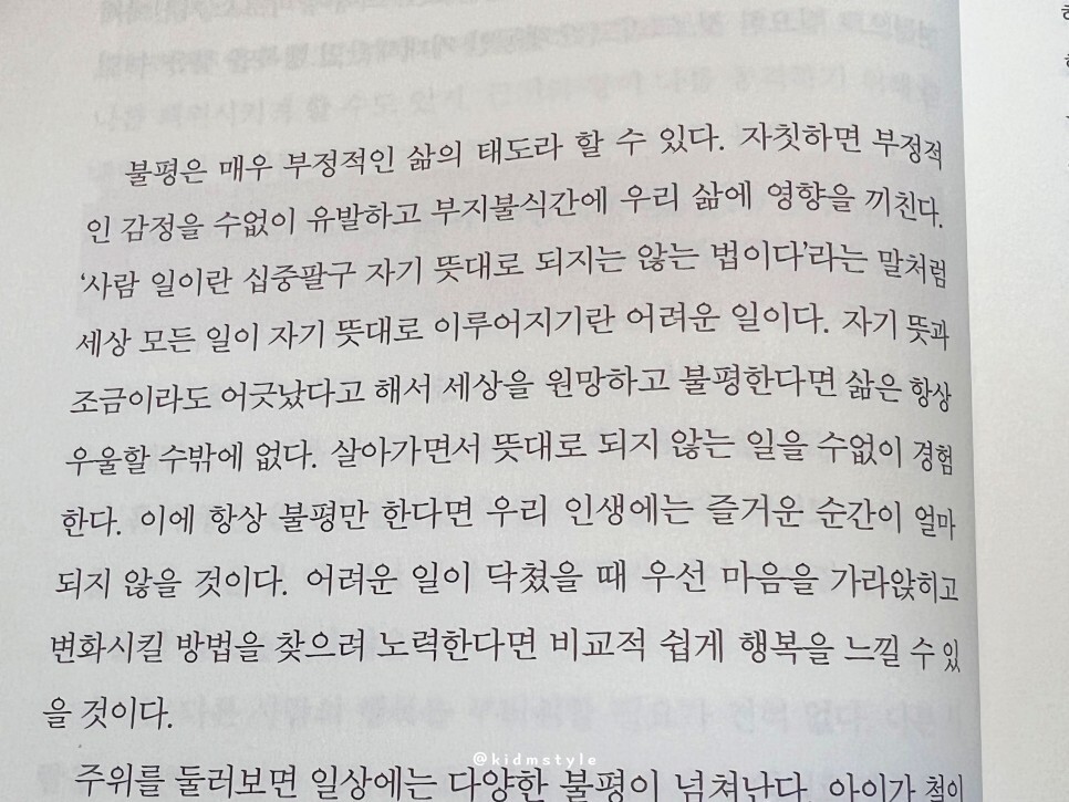 읽으면서 인상 깊거나 공감이 많이 되는 내용 위주로 조금 소개를 해본다. 요즘 불평불만이 많은 부정적인 태도를 가진 사람을 자주 볼 수 있다. 그런 사람들의 행동의 결과로 뉴스거리가 채워지기도 하고 말이다. 부정적인 태도는 도움이 안 된다. 긍정적인 삶의 태도로 바꾸자. 정말 중요하다.