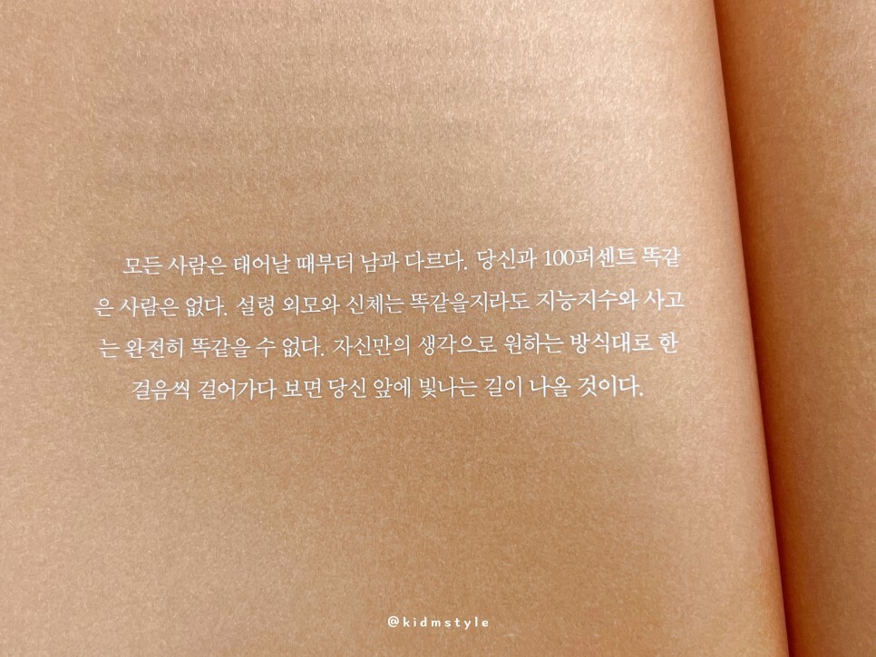 모든 사람은 다 다르다. 나와 100퍼센트 똑같은 사람은 없다. 내 생각을 바탕으로 한 걸음씩 걸어가다 보면 결국 빛나는 길을 만날 것이다.