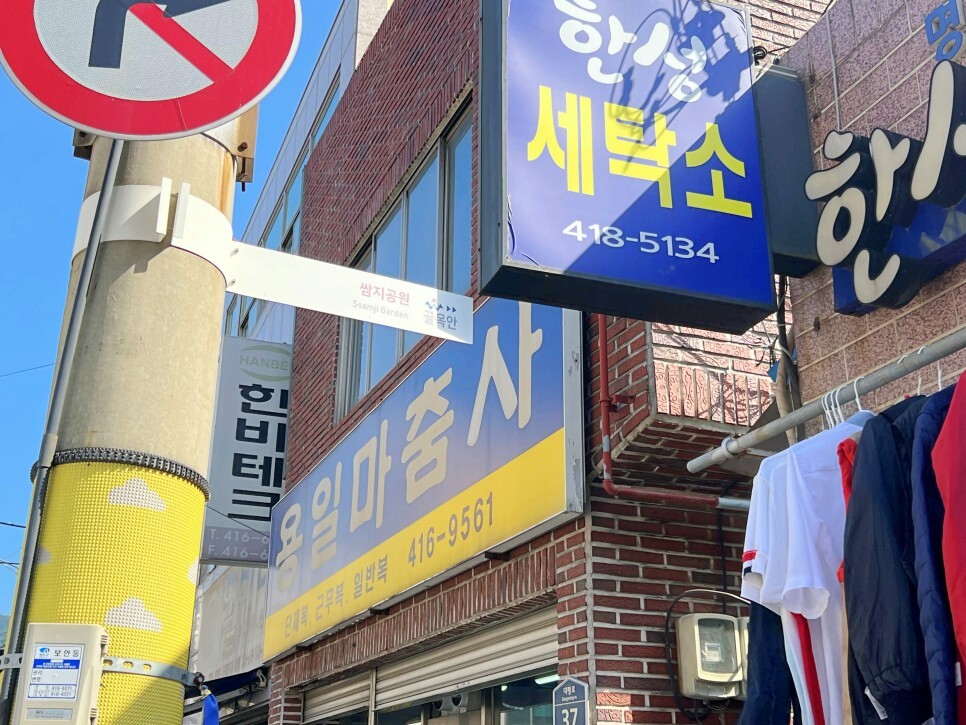 근처에서 조금 걸어서 세탁소 사이 골목으로 들어가 봅니다. 쌈지공원이 골목 안에 있어요.