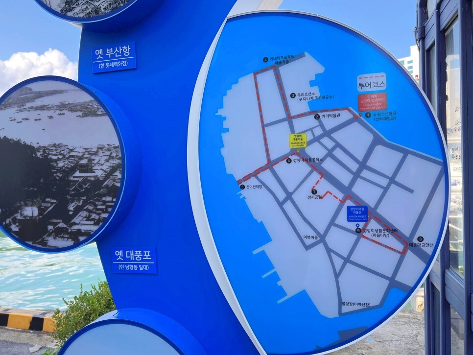 투어 코스가 표시되어 있는데요. 이 코스대로 걸으시면 깡깡이예술마을을 대부분 구경하실 수 있을 겁니다. 저도 오늘 이 코스로 걸어보았어요.