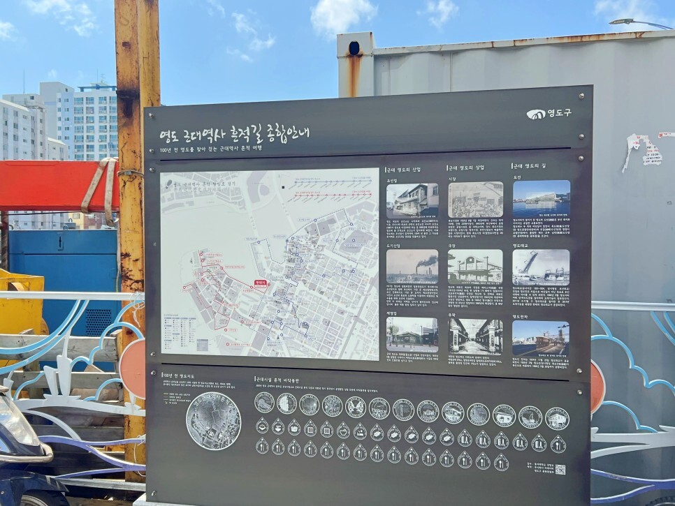 깡깡이예술마을로 향하는 길에 만난 영도 근대역사 흔적길 종합안내입니다. 근대 영도의 산업, 상업, 영도의 길 등을 주제로 다양한 근대역사의 흔적을 만날 수 있습니다. 도보로 충분히 다닐 수 있는 길이며 하나하나 찾아가 보시면 꽤 재미있으실 거예요.