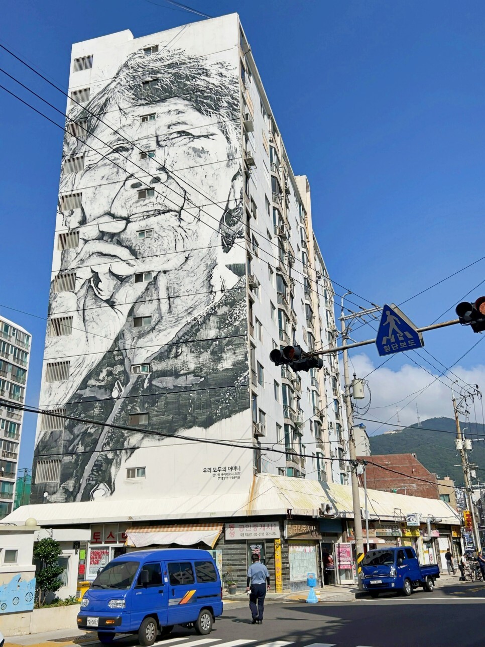 그리고 한 아파트의 외벽에는 우리 모두의 어머니라는 작품이 그려져 있습니다. 사실감 있는 표현이 참 멋집니다. 깡깡이예술마을을 대표하는 작품이 아닌가 싶습니다.