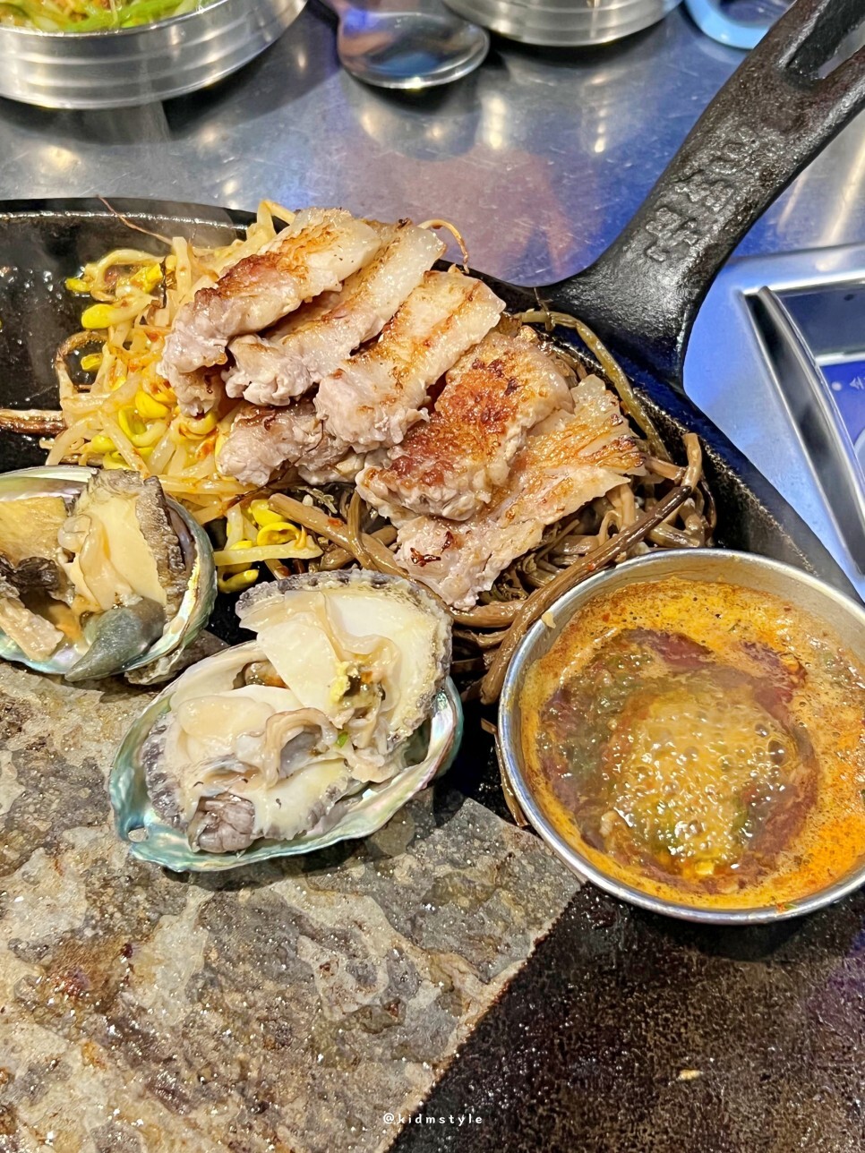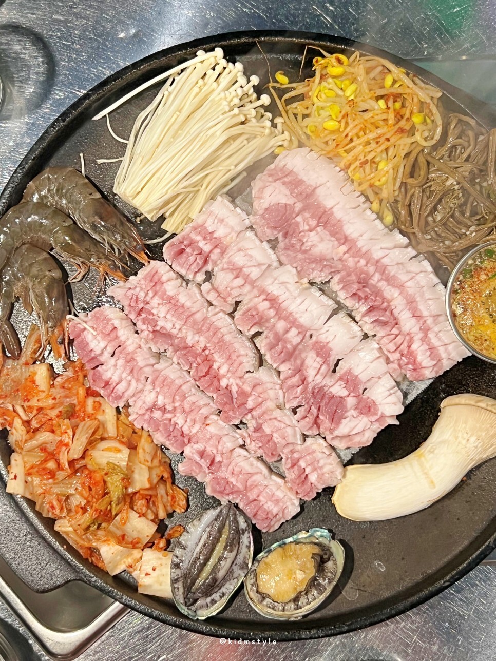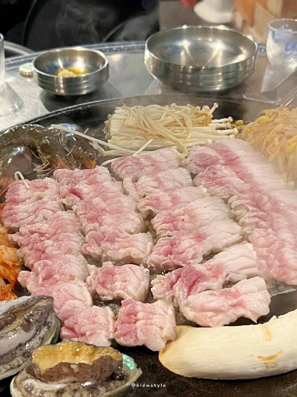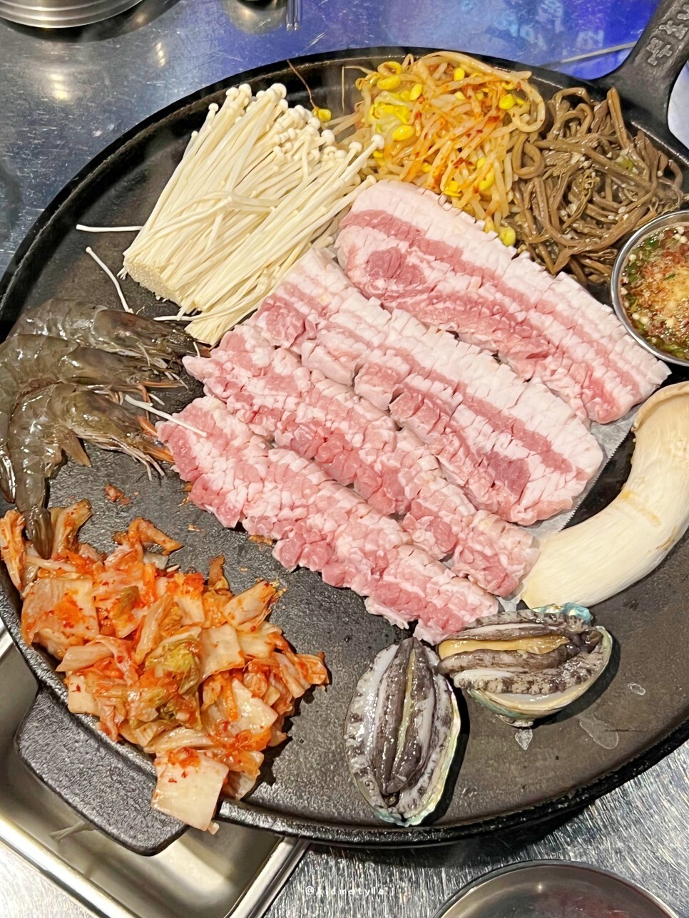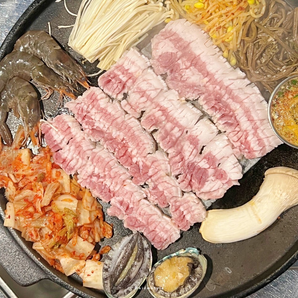 칼집이 섬세하기 들어간 제주산 오겹살과 전복, 새우, 버섯이 등장한다. 이게 불판에 올라가게 된다. 칼집이 아주 예술이다. 사장님이 직접 매일매일 손질하는 고기이다.