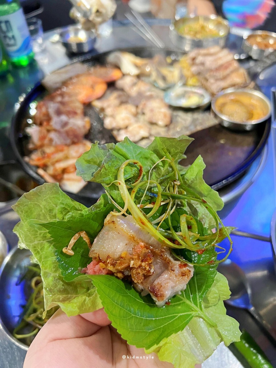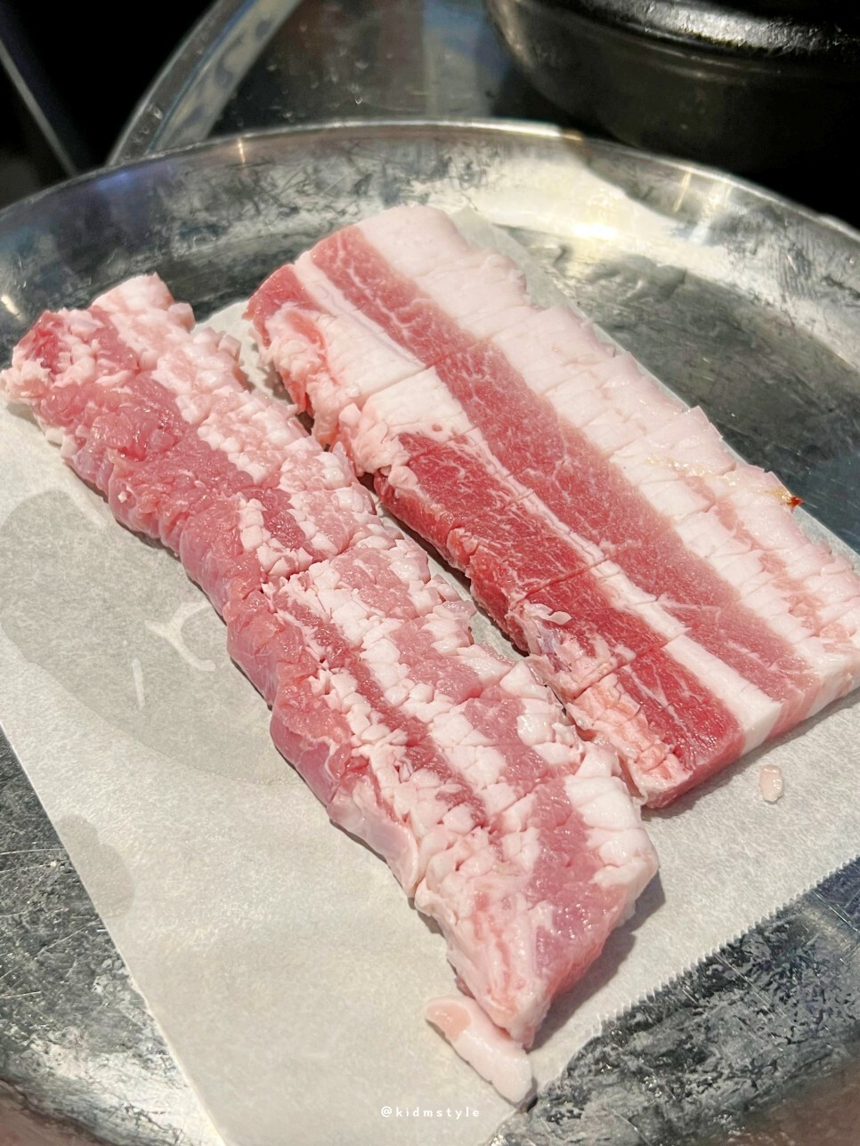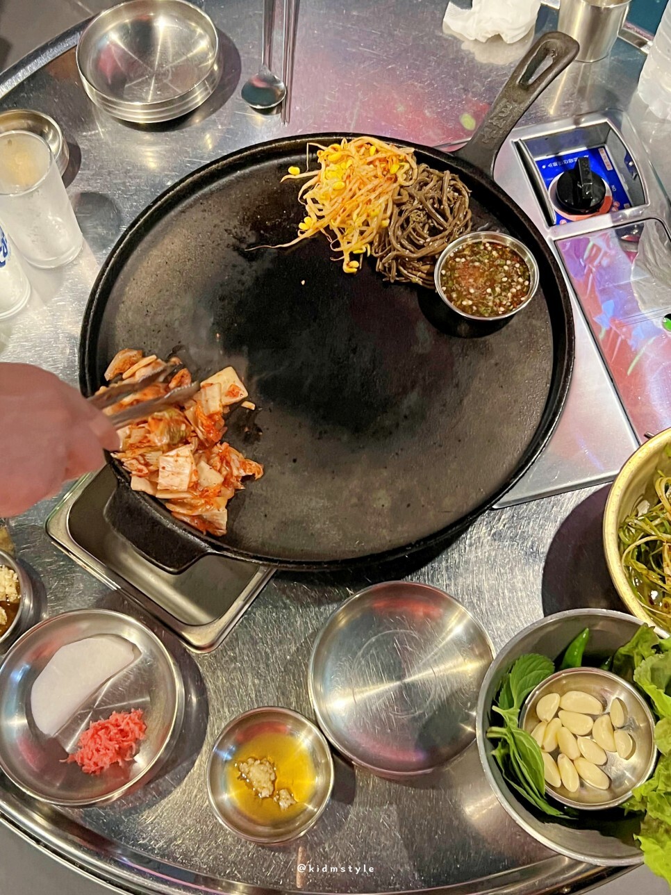 불판 위에 깔린 모습이다. 이 비주얼을 인스타에서 한 번쯤 보셨을 거다. 아는 맛이라 더 기대가 된다. 친구는 처음 방문했는데 비주얼을 보고 놀라더라.