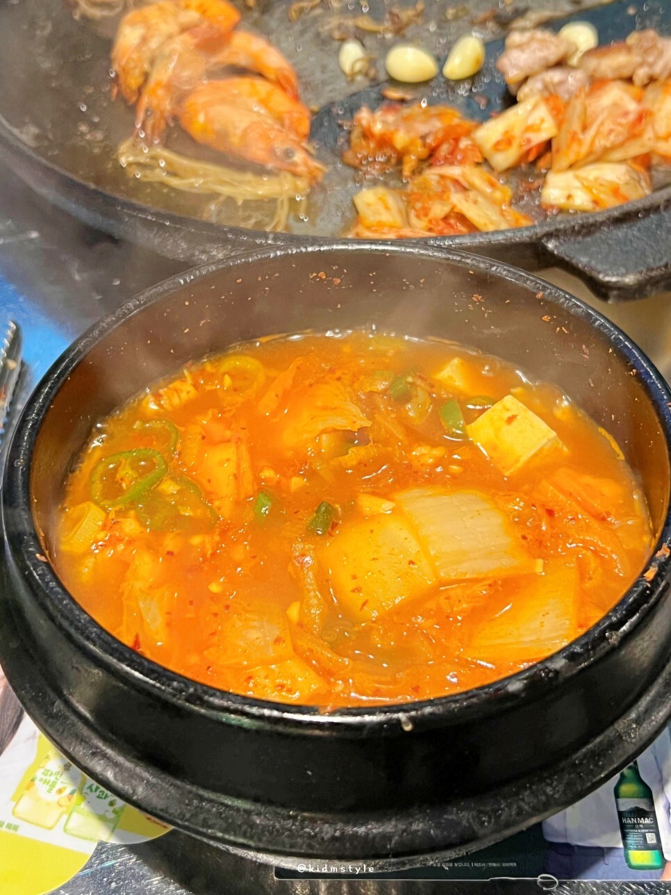 대화가 너무 재미있게 흘러갔고 서비스로 김치찌개도 주시네. 김치찌개 덕분에 소주도 더 시키고