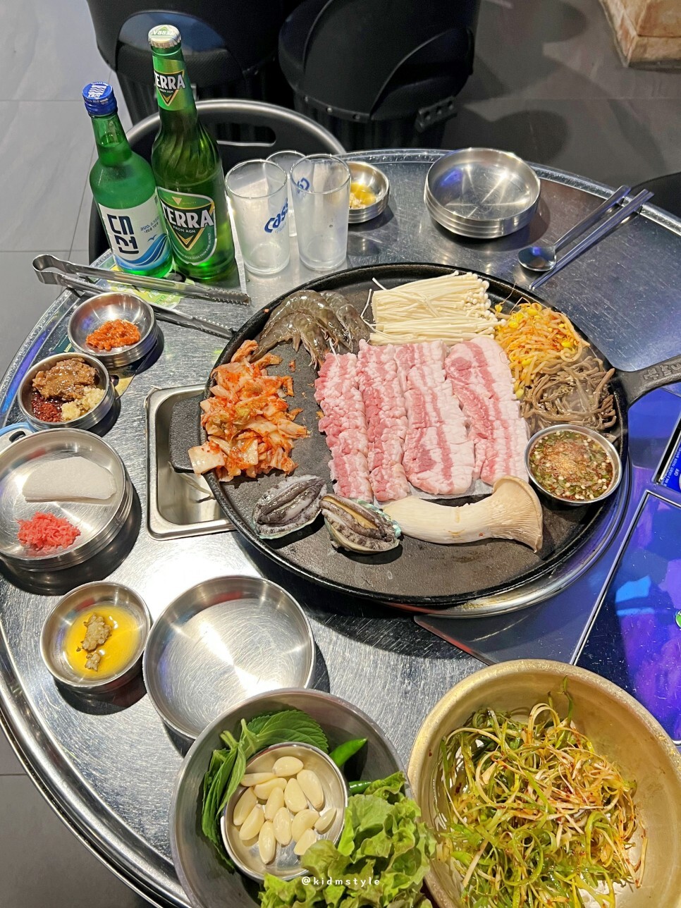 우리 테이블은 잘생긴 사장님이 직접 구워주신단다. 상차림이 시작되고 불판도 하나하나 채워지기 시작한다. 사장님과 이때부터 이런저런 대화를 정말 많이 나눴는데 나와 같은 또래이고 비슷한 부분도 많아서 이야기가 아주 재미있게 흘러가서 엄청 친해졌다.