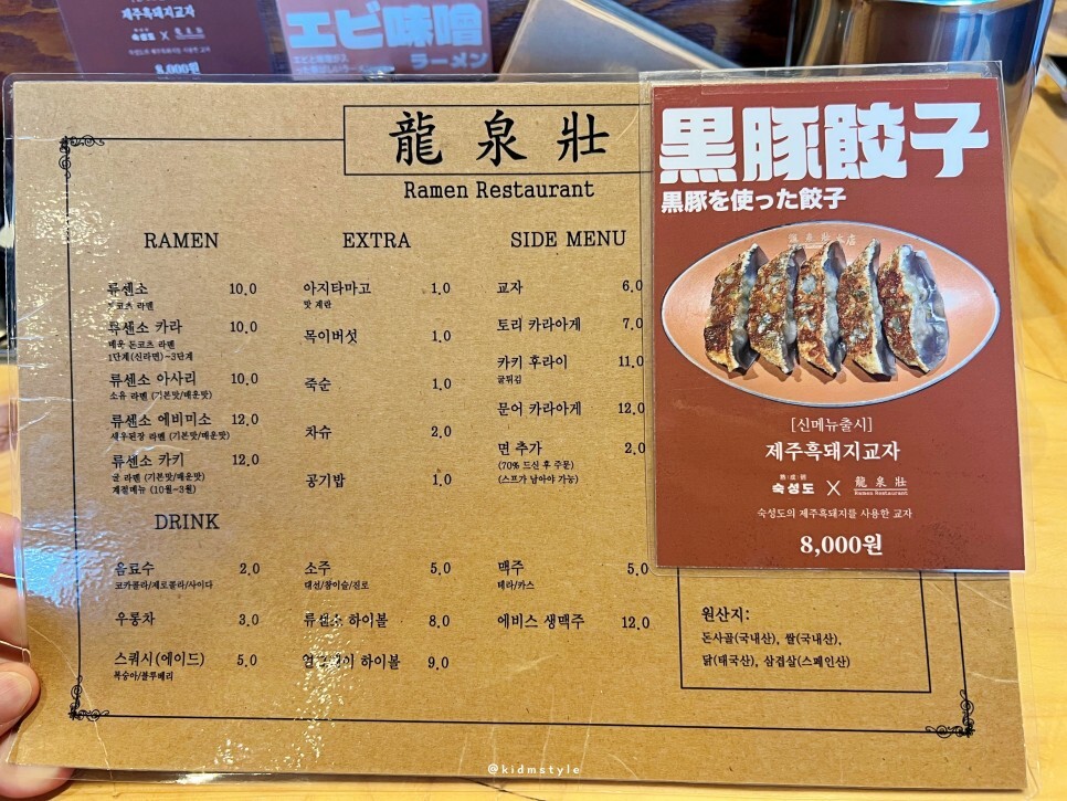 메뉴판이다. 고민 없이 류센소를 주문한다. 돈코츠라멘이다. 다른 라멘도 많이 즐겼지만 내 입에는 돈코츠라멘만한 게 없다.
