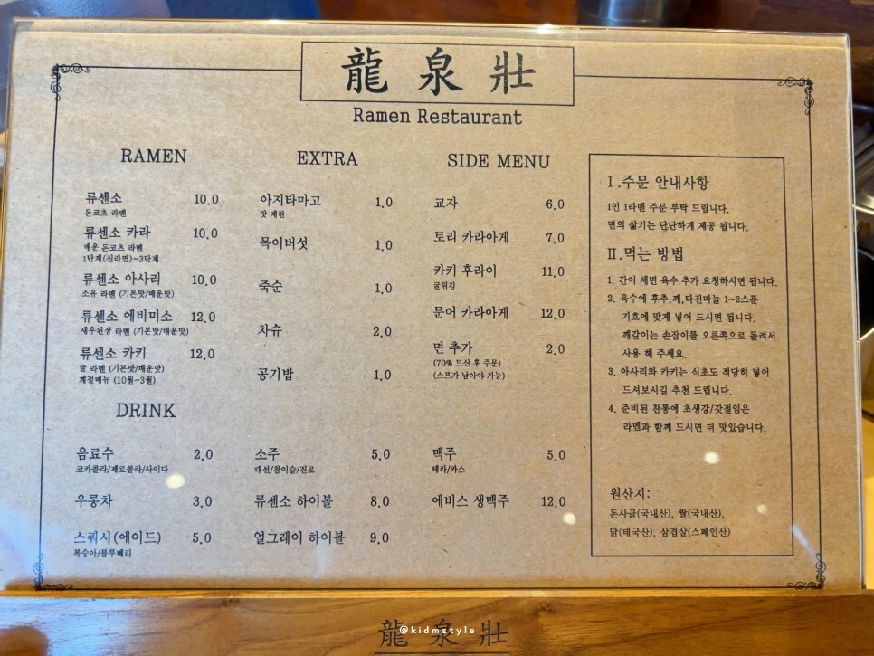 간판인 류센소 龍泉壯 한자로 용천장이다. 이 상호 뜻에 대해 설명해 놓은 류센소 포스팅을 거의 보지 못했다. 좀 찾아보니 용천장 龍泉壯은 용이 사는 곳이라는 뜻이며 류센소를 만든 사장님이 일본에서 일했던 가게 이름이라고 한다.