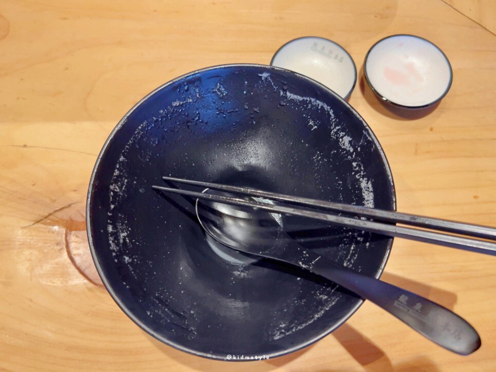 하카타 현지에서 먹는 돈코츠 염도보다는 낮지만 확실히 류센소 지점에 비해 본점의 염도가 높은 건 사실이다. 염도가 높지만 일반적인 입맛 기준으로 맛본다면 기분 좋게 먹을 수 있는 정도 수준이라고 할까? 솔직히 현지 돈코츠에 익숙해진 내 입맛에는 이건 그냥 적당한 정도이다.