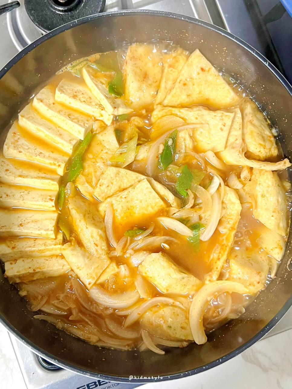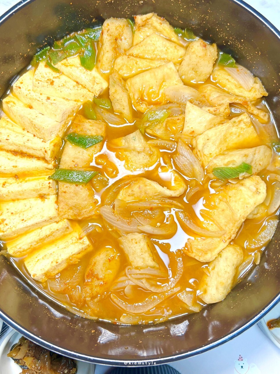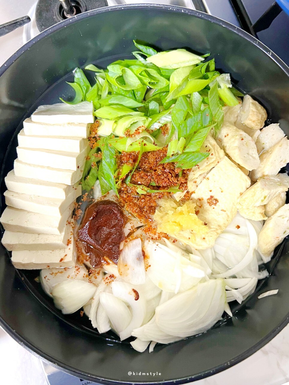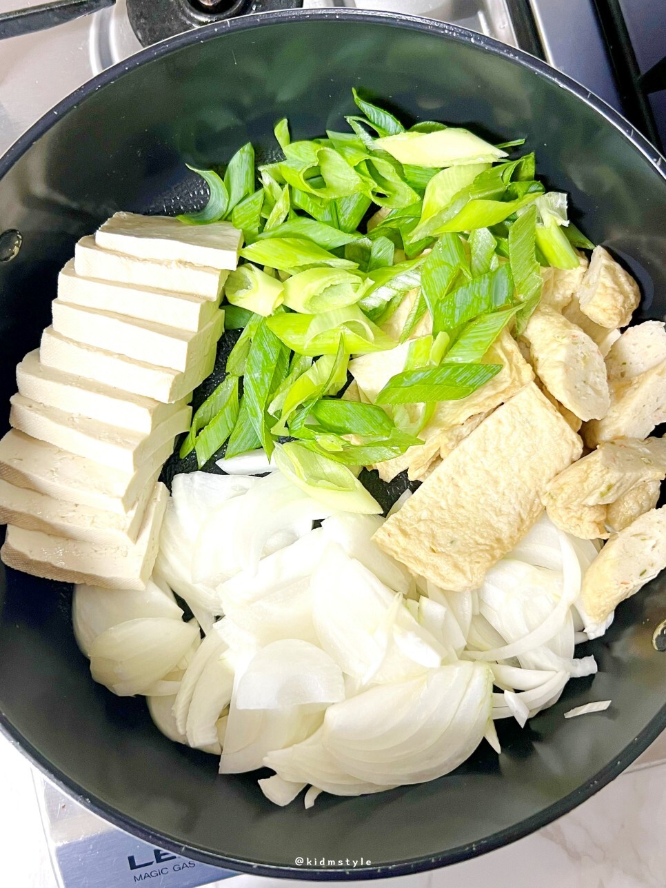 두 끼 정도 먹을 거라서 두부는 반 모, 양파 하나, 대파 쏭쏭, 냉동실에 오뎅 있던 거 꺼내서 대충 썰어 준다. 그리고 전골냄비에 쫙 깔면 끝.