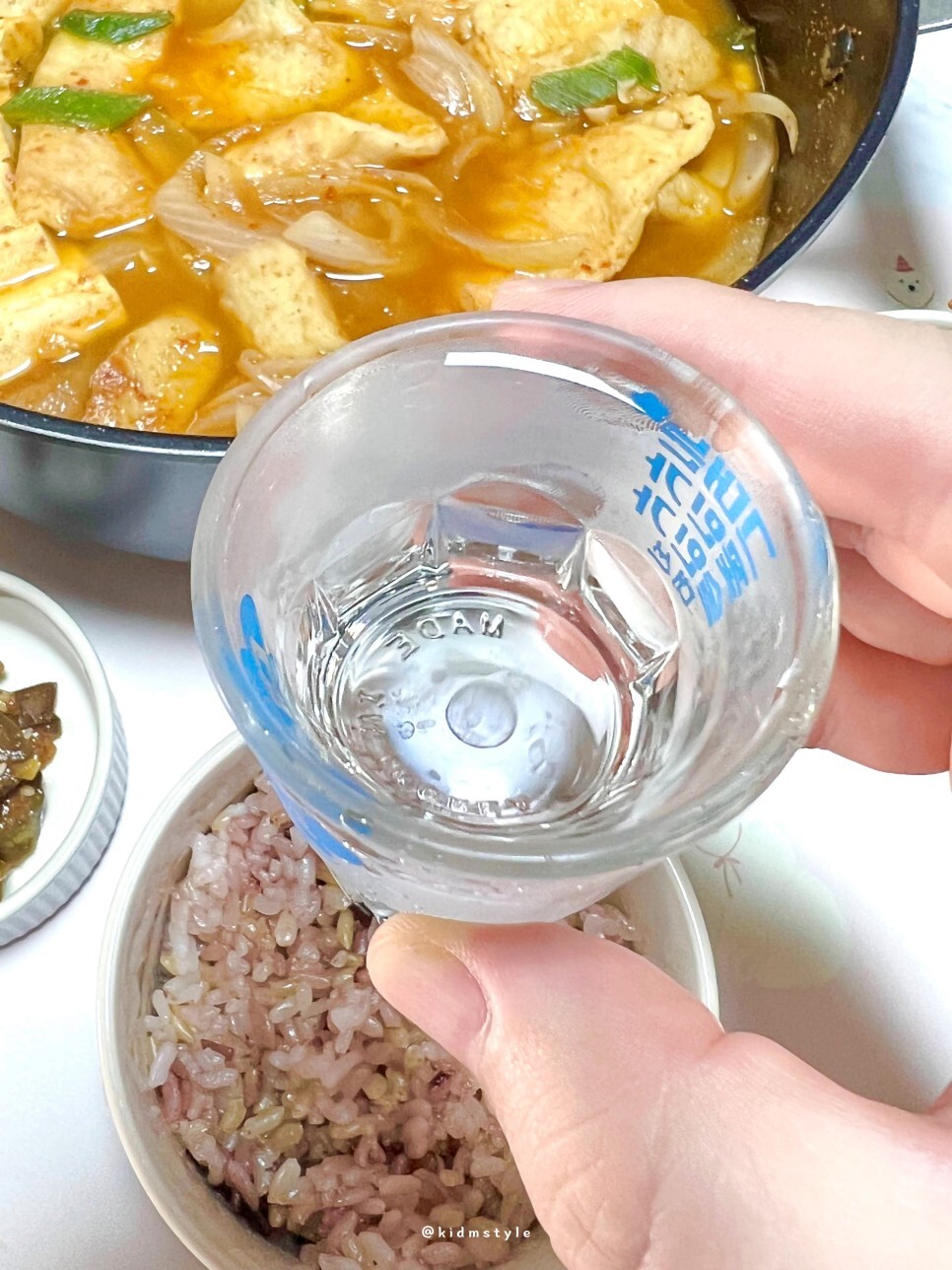 끝이다. 정말 간단하다. 소주 한잔할 생각이 없었는데 찌개 한 숟가락 떠먹어보니 한 잔 안 할 수가 없다. 반찬은 묵은지, 가지볶음, 고추지 정도면 충분하다.