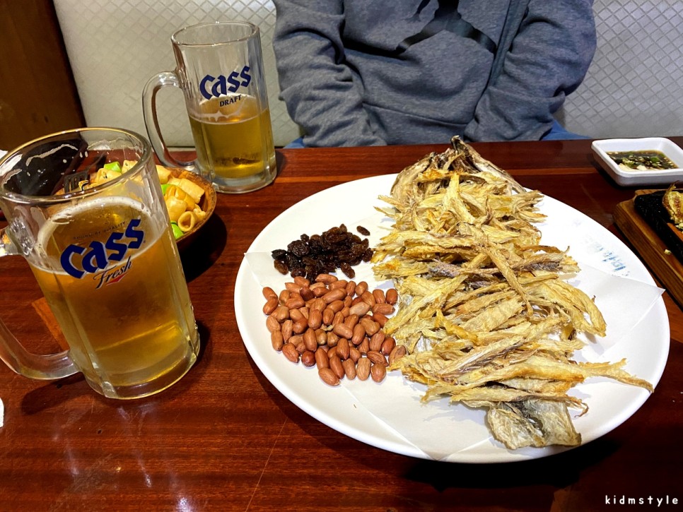 사이드에 나오는 건포도와 땅콩만으로도 맥주 몇 잔은 먹을 수가 있다.