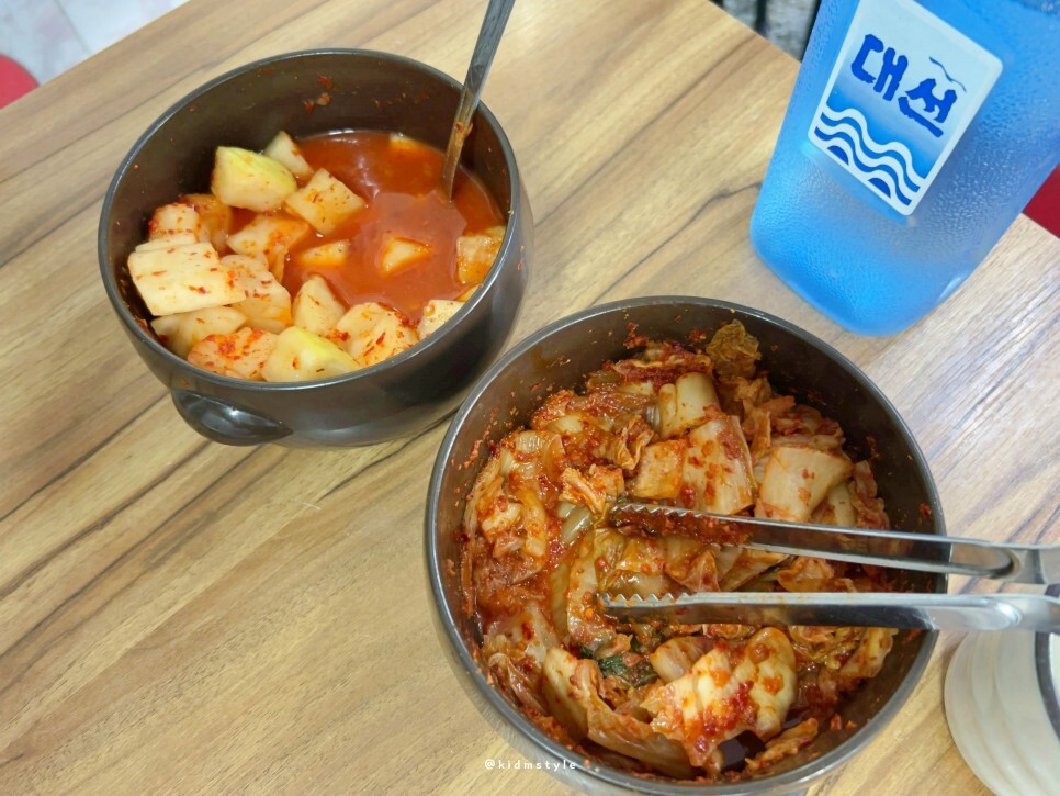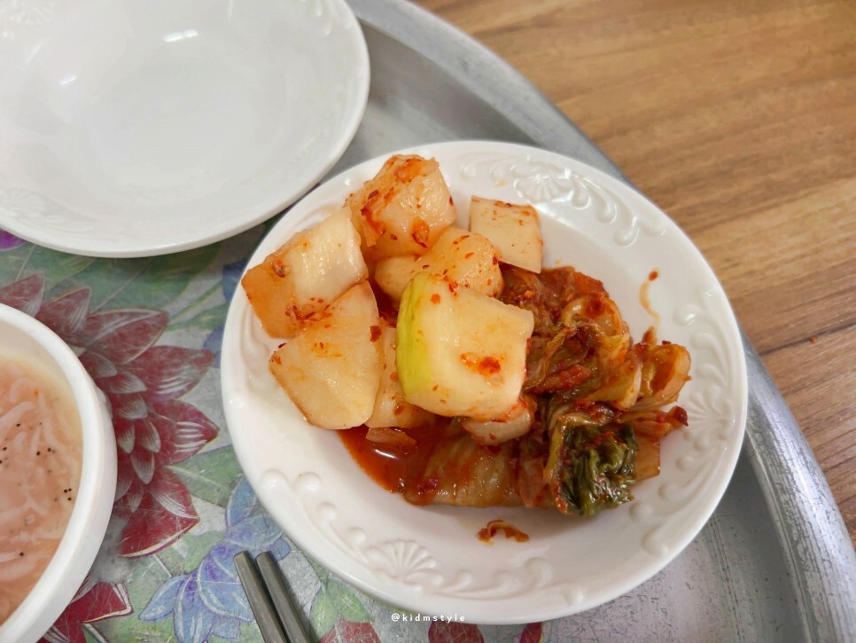 깍두기와 김치가 테이블에 놓여있는데 원하는 만큼 덜어먹는 시스템이다. 둘 다 식당에서 직접 담그는 김치이다.