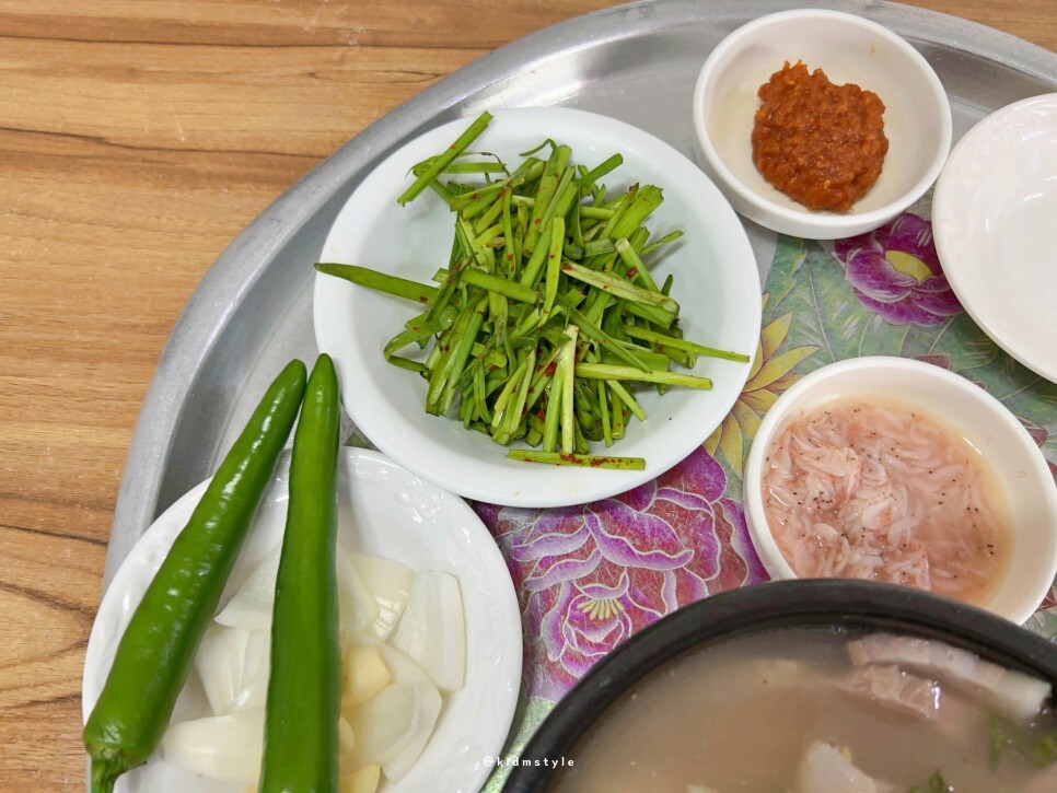 고추, 양파, 마늘은 신선함이 느껴진다. 부추무침은 양념이 과하지 않아서 국밥에 넣어먹어도 맛 변화가 커지지 않아서 좋다.