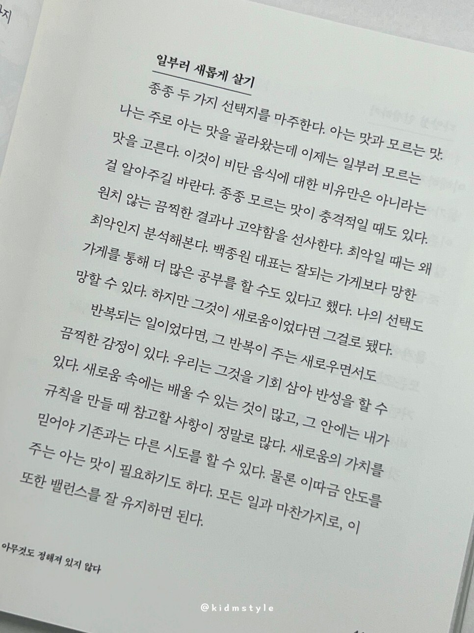 작가는 본인의 경험을 그대로 책에 담아냈다. 어느 여행지에서 쓰는 글이라는 페이지도 자주 나오고 말 그대로 에세이. 그래서 술술 읽힌다. 협찬 글이라면 무조건 색안경을 끼고 보는 사람이 많은데 내가 읽고 나서 있는 그대로 쓴다.