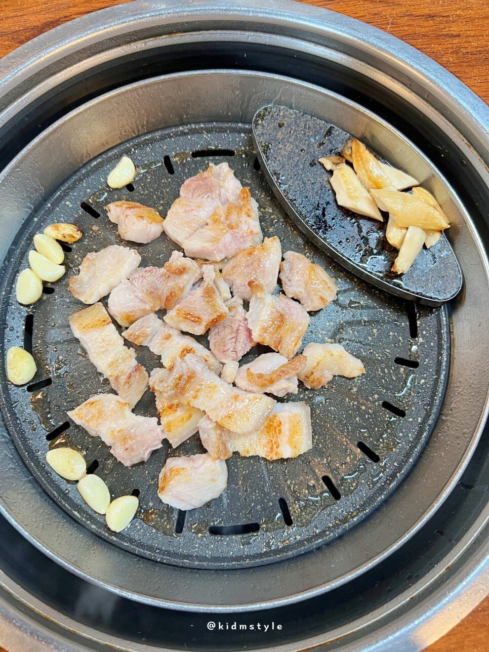 타지 않게 육즙 가두면서 잘 구워본다. 집게 마스터 실력 어디 가겠나? 마늘도 굽고 새송이버섯도 굽고.