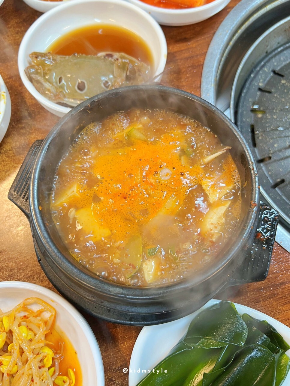 고기를 더 시킬까 고민하다가 2차에서 더 먹기로 하고 공깃밥과 된장찌개를 주문한다. 밥을 주문하면 게장도 나온다. 된장찌개는 해물 육수 베이스의 시원한 된찌라 땡초 하나 썰어 넣으면 아주 맛있는 찌개가 된다.