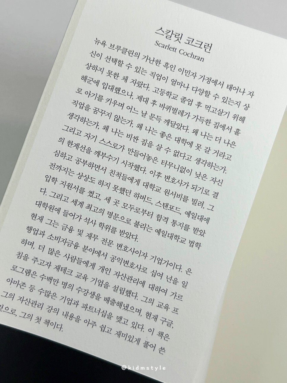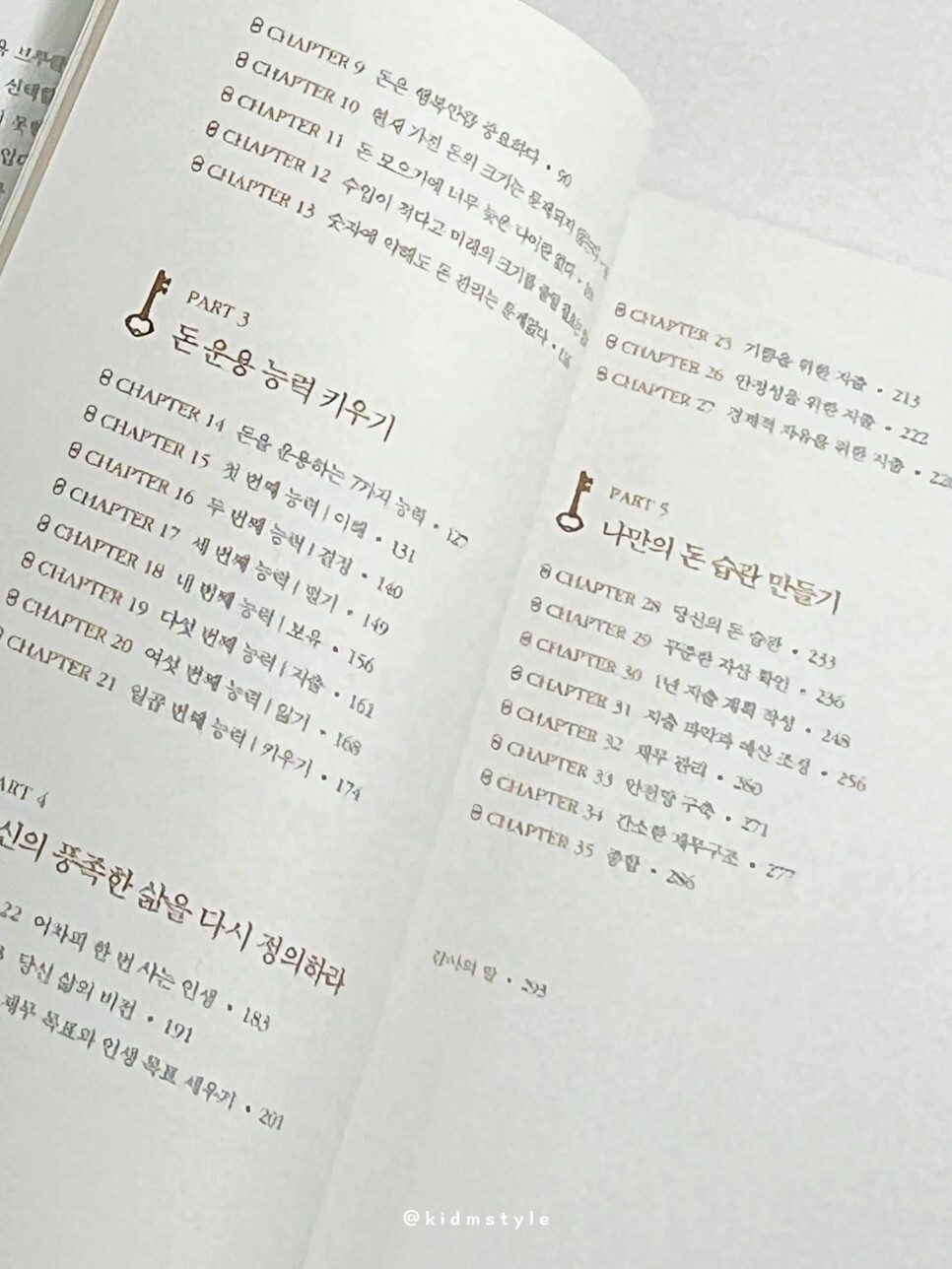 돈의 운용과 돈 습관을 만들고 나 자신이 스스로 인정할 수 있는 풍족한 삶에 대한 정의까지. 결국 남의 이야기는 '참고'만 하고 본인만의 가치관대로 움직이는 것이 가장 중요하다는 것을 또 느낀다.