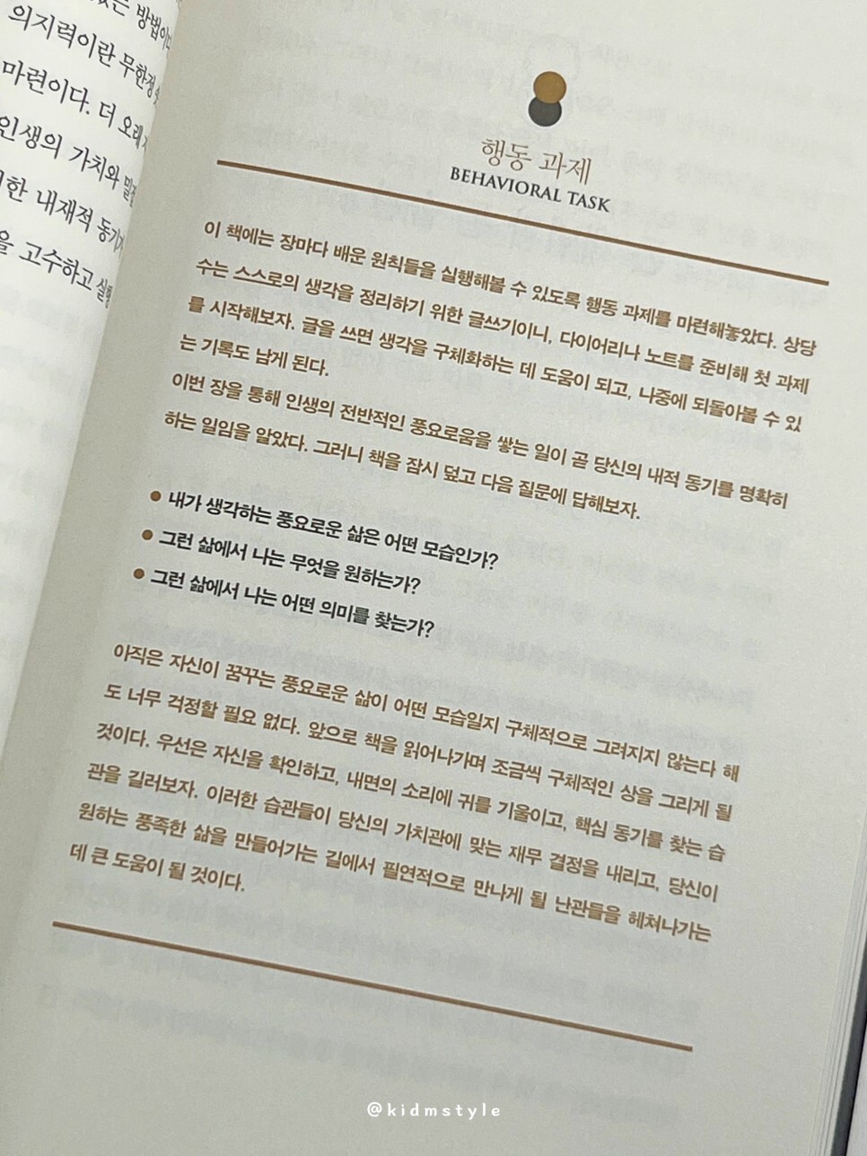 책을 읽다 보면 파트 별로 제시하는 원칙들을 직접 행동으로 실천해 볼 수 있는 과제가 나와있어서 괜찮더라. 주식, 코인, 부동산을 어떻게 투자하는지에 대한 이야기가 아니지만 이런 원론적인 부분도 상당히 중요하다고 생각한다.