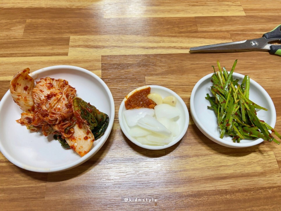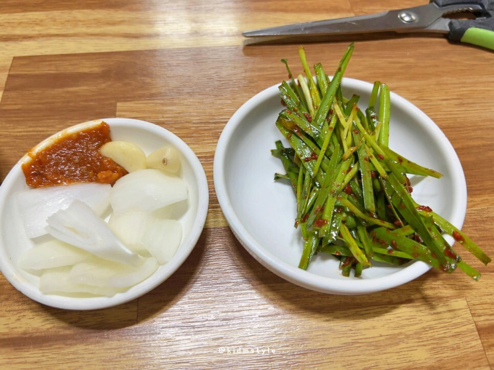 양파와 마늘 상태는 좋고 정구지 무침 역시 부추 상태가 좋으며 깔끔하고 과하지 않게 잘 부쳐냈다.