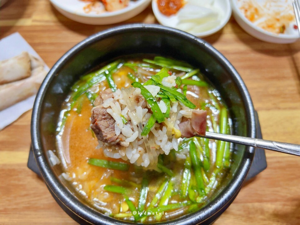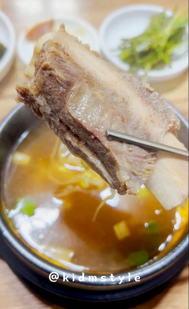 얼마 걸리지 않아 스테인리스 그릇에 가득 담은 흰쌀밥과 팔팔 끓는 뚝배기가 나온다. 뜨거움이 조금 사라지길 기다렸다가 맛본다. 국물이 조금 특이하다. 예전 포스팅에도 소개했지만 갈비탕, 콩나물국, 소고기국밥 등 세 가지 음식의 맛이 나기 때문에 재미있게 맛볼 수가 있다.
