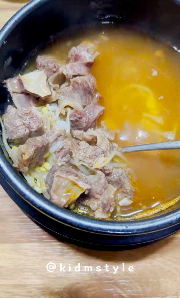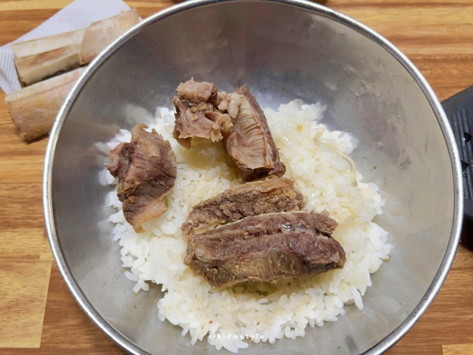 뼈에 붙은 갈비를 분리하고 밥 위에 올린 다음 가위를 사용하여 먹기 좋은 크기로 하나하나 잘라서 뚝배기에 다시 넣고 먹으면 된다. 글 아래에 있는 영상을 꼭 보기 바란다. 인스타그램 팔로우도 해주시면 좋겠다.