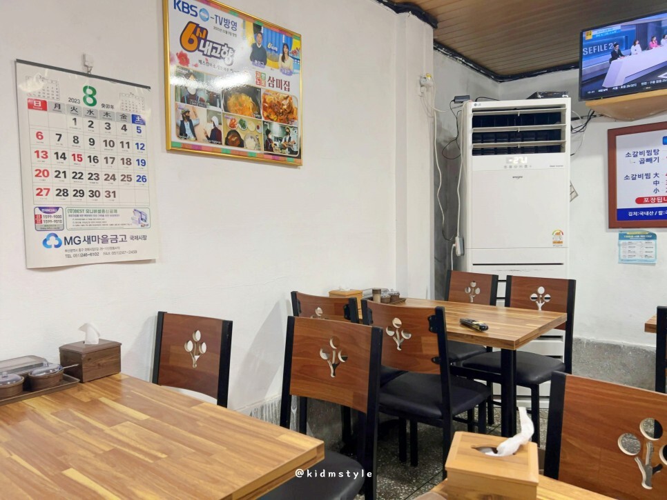 6시 내고향에 출연한 적이 있는 흔적, 유난히 더웠던 올해 8월의 달력. 그리고 오래간만에 왔더니 테이블과 의자가 바뀌었네.