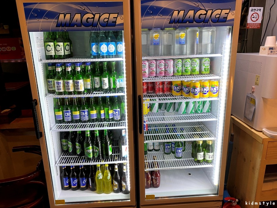 그 옆으로 냉장고에 술과 음료가 가득 들어있는 모습이다.