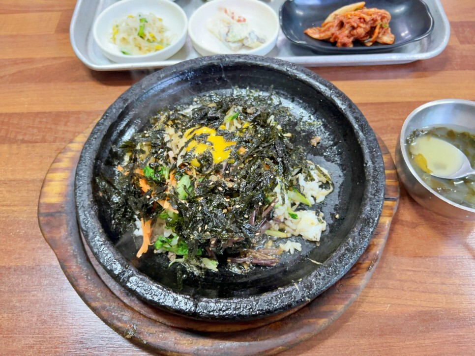 얼마 걸리지 않아 돌솥비빔밥이 나왔습니다. 커다란 돌판이 아주 인상적이죠? 미역국부터 호로록 마시고 시작합니다.