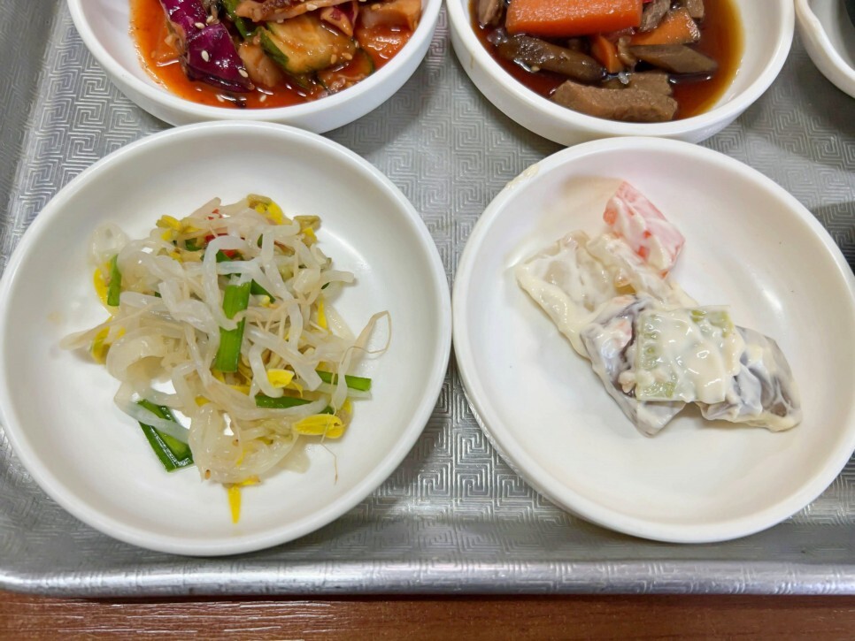반찬이 먼저 나왔습니다. 반찬은 매번 바뀌는데요. 오늘 나온 반찬도 다 좋아하는 것들이네요.