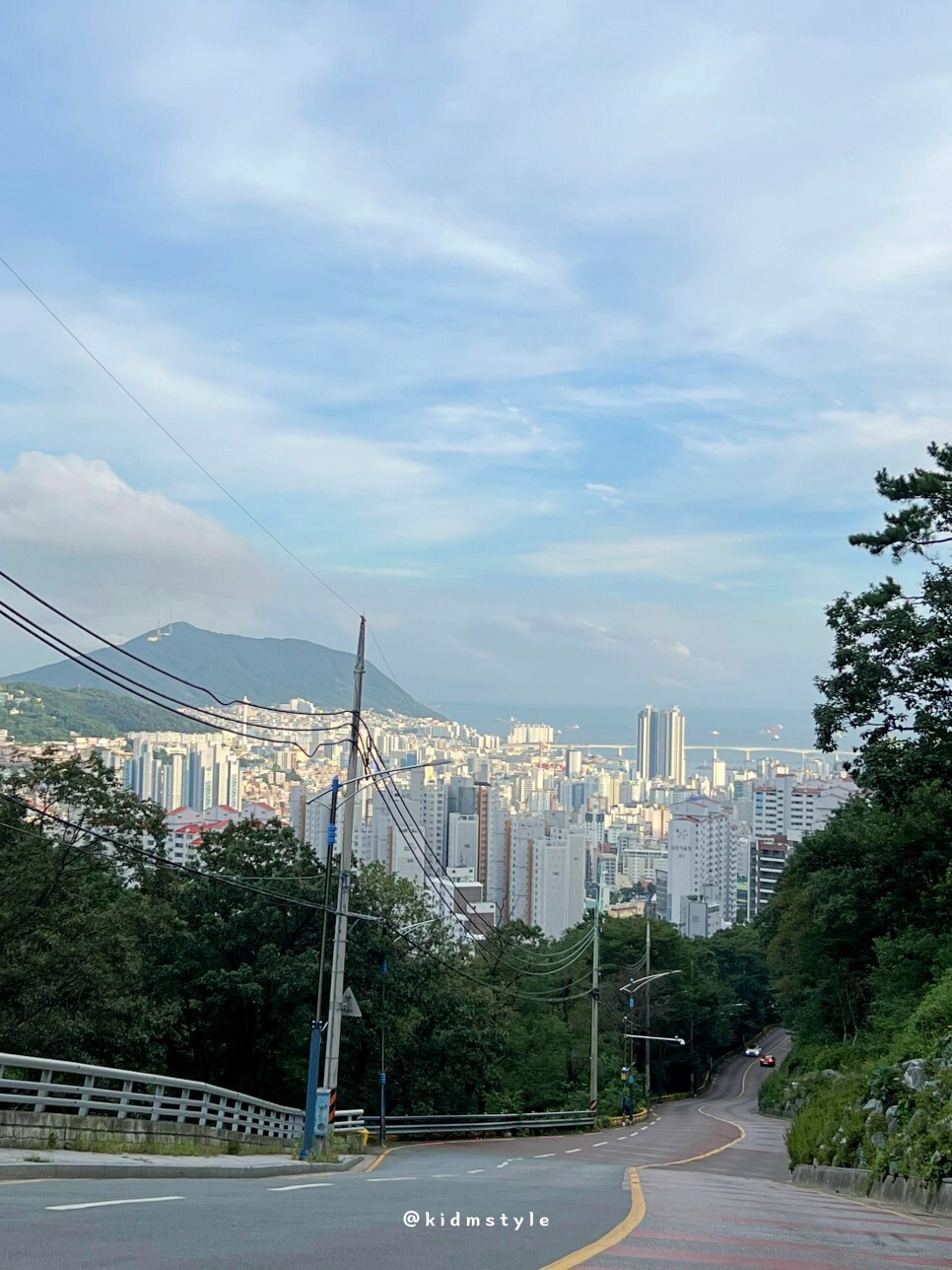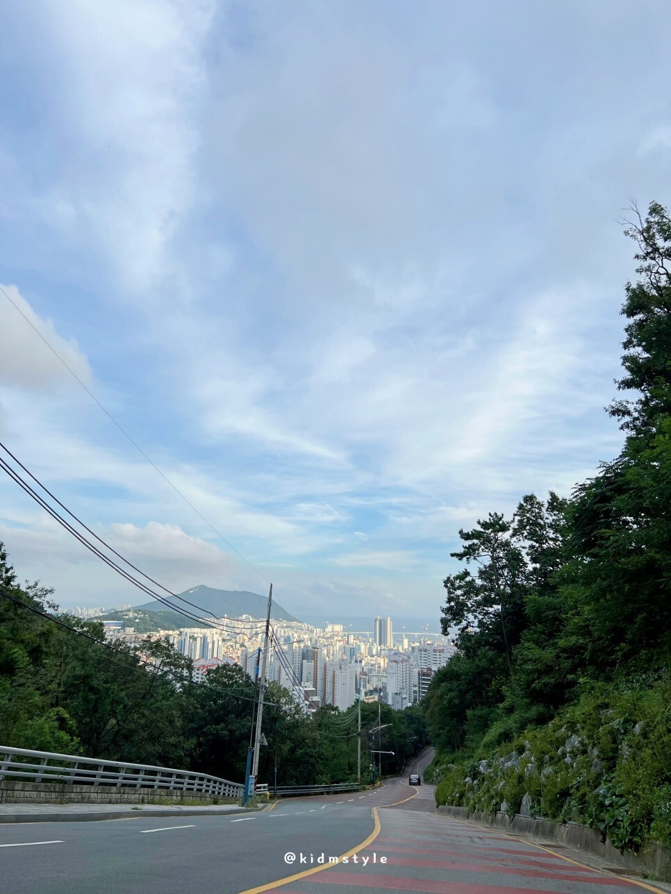 그렇게 절에서 잠깐의 힐링 시간을 가지고 내려간다. 꽃마을로는 꽃마을에서 아래로 내려가는 경사가 제법 되는 도로이다. 옆에 잠시 차를 정차하고 사진을 찍어본다. 이곳에서 바라보는 부산 원도심의 풍경도 참 멋지다. 사진에 경사와 멋짐이 다 담아지지 않아서 아쉽다.