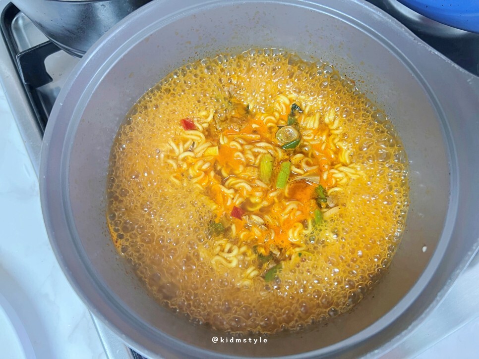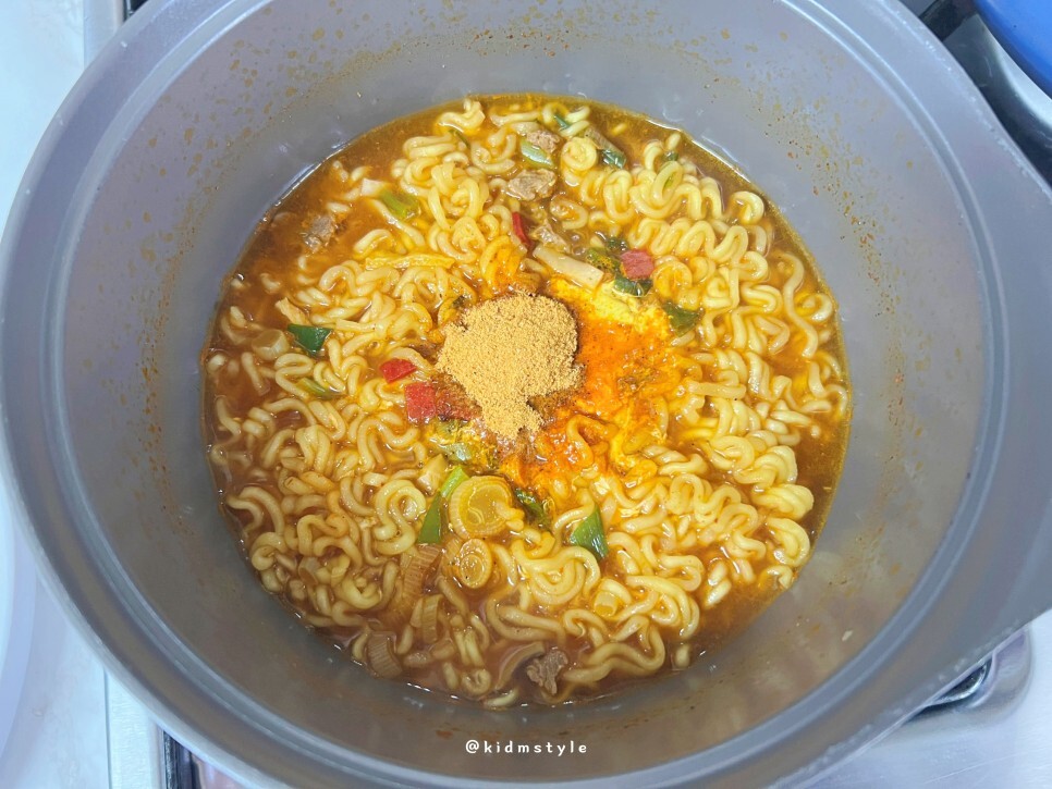 면을 넣고 전첨분말스프도 뿌려준다. 매콤한 향이 확 올라온다.