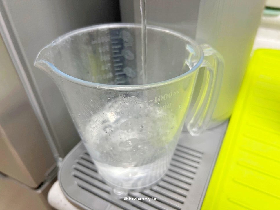 계량컵에 물을 받고