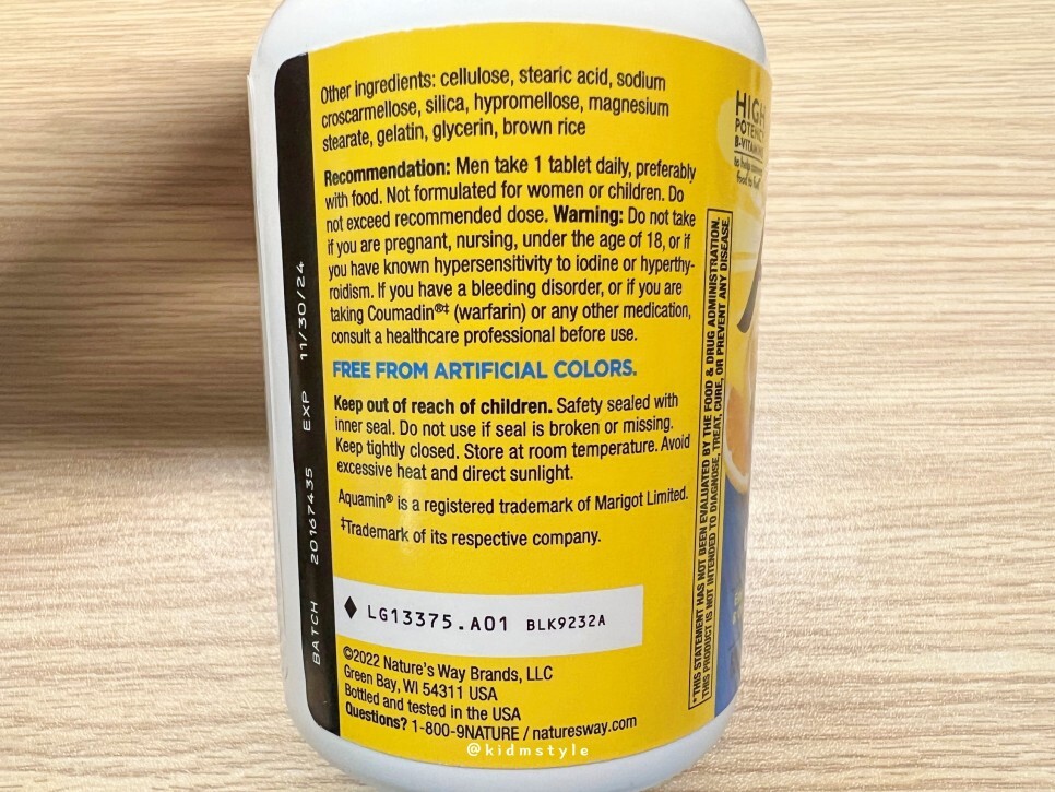 종합 비타민답게 비타민 A, B, C, D, E, K, 칼슘, 마그네슘, 등 다양한 성분이 들어가 있다. 하나하나 용량을 따져서 선택한다면 더 비싼 제품이 어울릴 것이다.