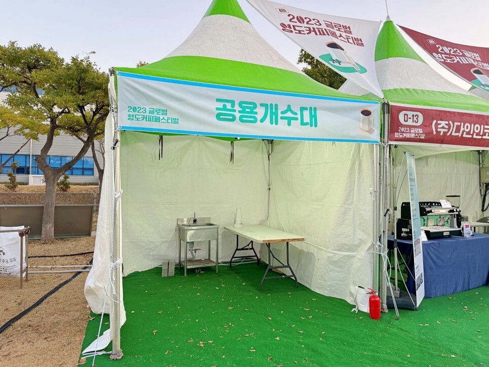 행사장 곳곳에 공용 개수대가 있는데요. 플라스틱 컵을 제공해서 개인컵에 커피를 시음하고 개수대에서 씻고 할 수 있어요. 작은 정수기도 있으니 물도 마실 수 있고요.